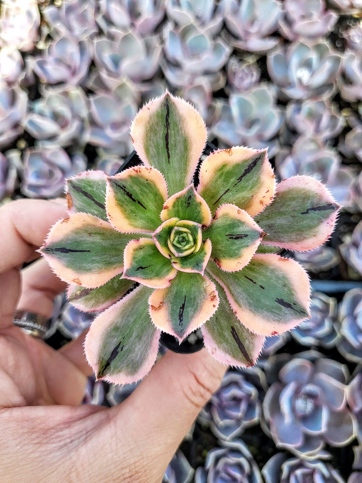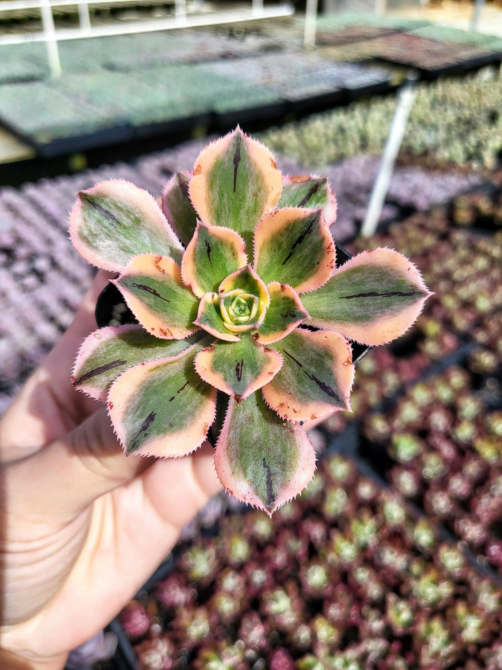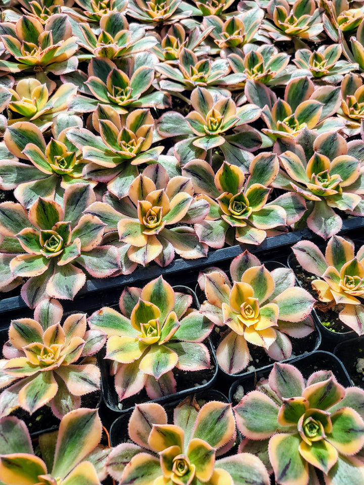 Aeonium 'Sunburst', commonly known as Copper Pinwheel, is a captivating succulent admired for its vibrant, variegated foliage and unique growth habits.